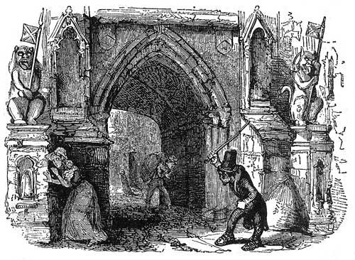 “There was an empty niche from which some old statue had fallen or been carried away hundreds of years ago, and she was thinking what strange people it must have looked down upon when it stood there, and how many hard struggles might have taken place, and how many murders might have been done, upon that silent spot, when there suddenly emerged from the black shade of the arch, a man. The instant he appeared, she recognised him—Who could have failed to recognise, in that instant, the ugly misshapen Quilp!”