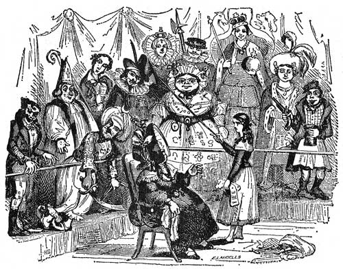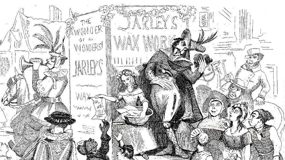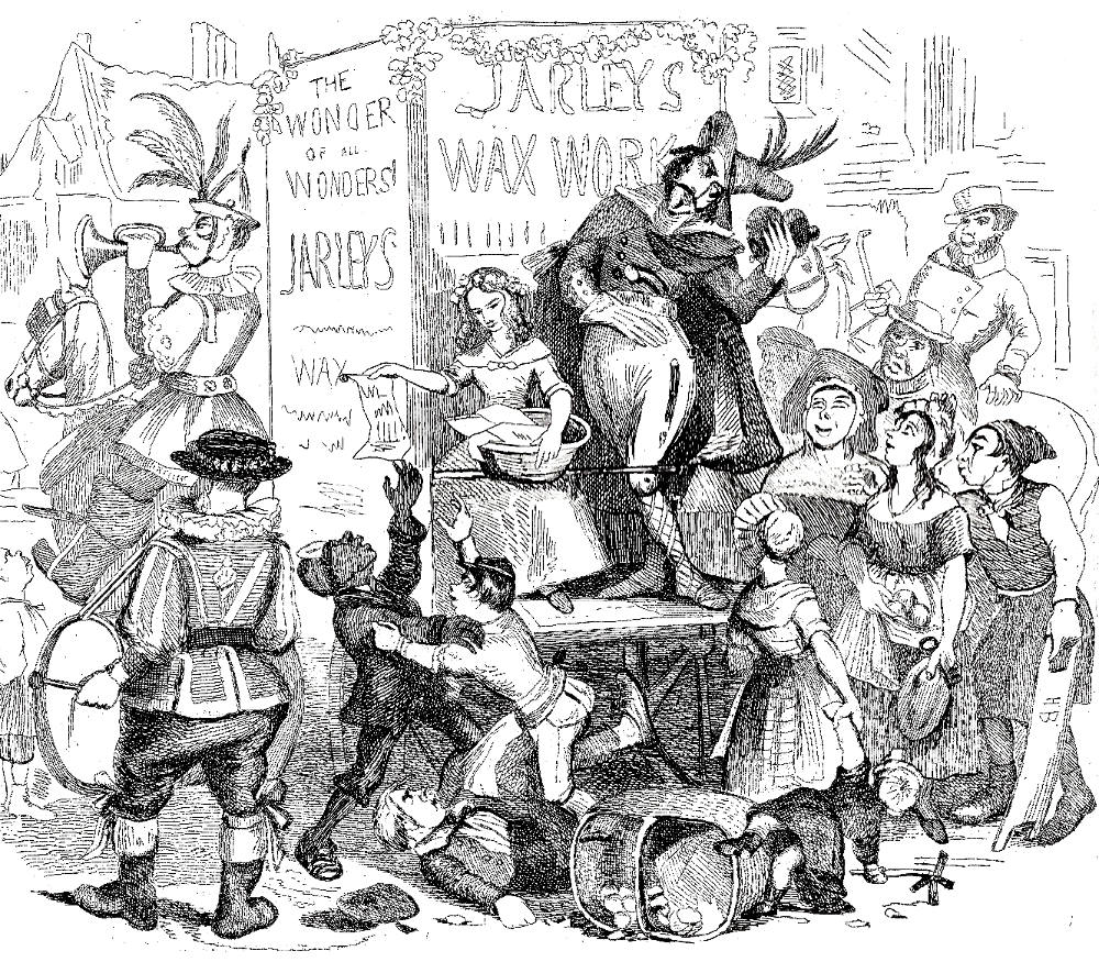 Though Quilp features regularly in Nell’s nightmares, she is busy enough getting to know Mrs. Jarley’s business during the day, and all the spectators take a fancy to Nell, who is dolled up and contrasts sharply with those about her. School groups come to view the waxworks—and Mrs. Jarley alters the identities of the murderers and more unsavory figures to suit a school-age audience.