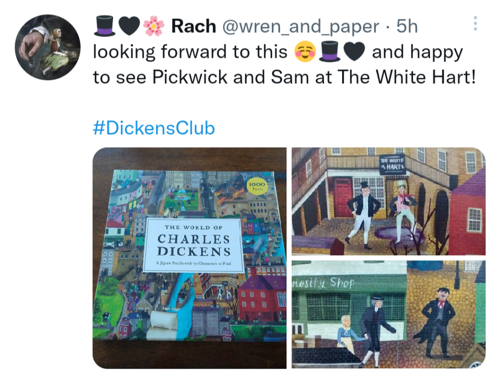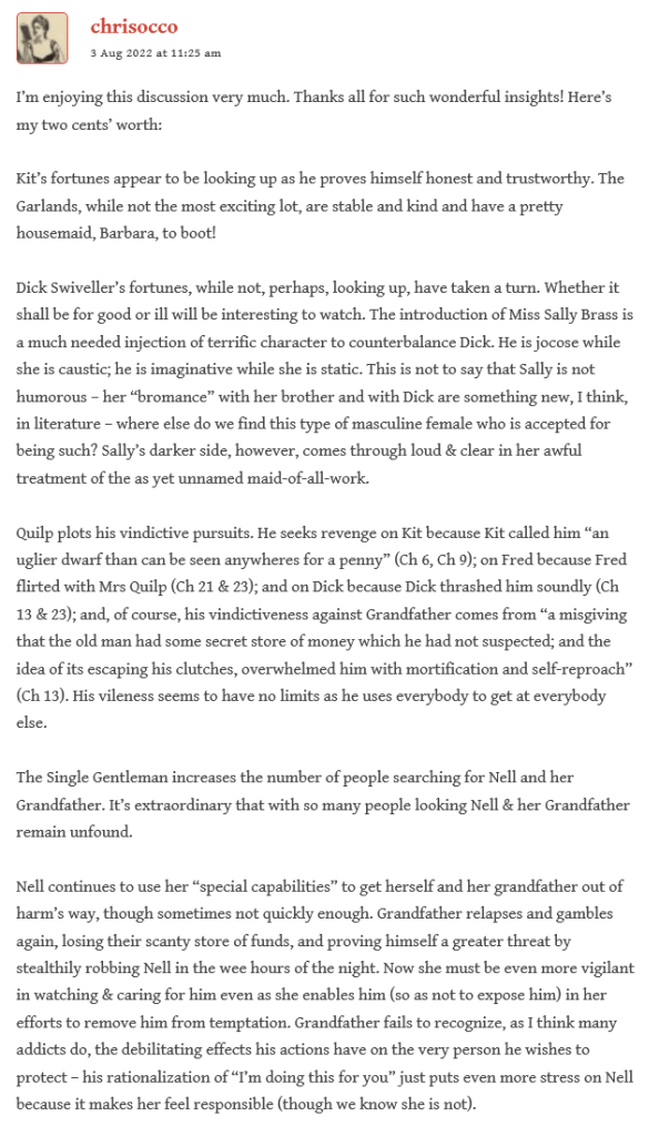 And for any more recent members or for those who might be interested in joining: the revised two-and-a-half year reading schedule can be found here. Boze’s marvelous Introduction to Master Humphrey’s Clock and The Old Curiosity Shop can be found here. If you’ve been reading along with us but aren’t yet on the Member List, we would love to add you! Please feel free to message Rach here on the site, or on twitter.