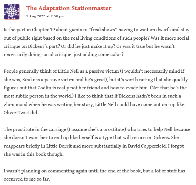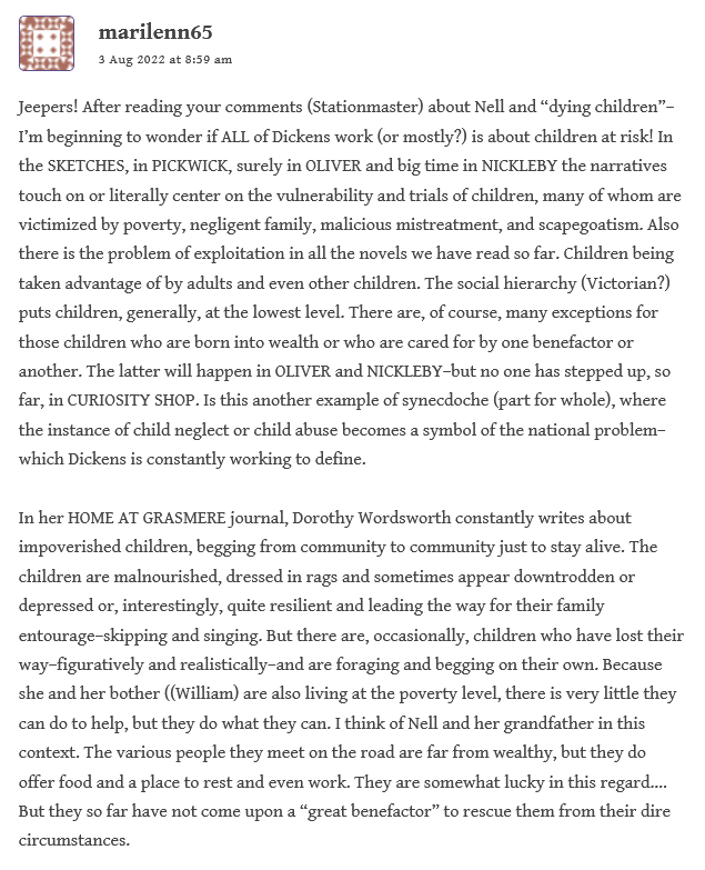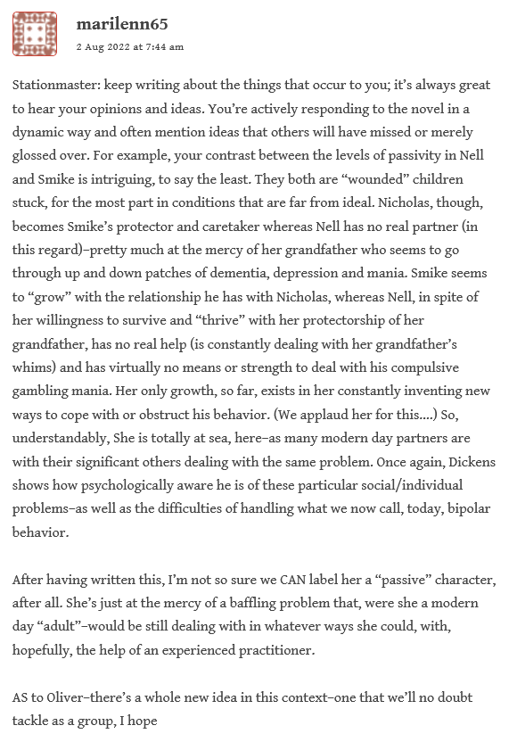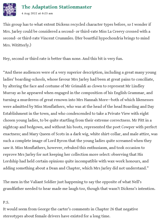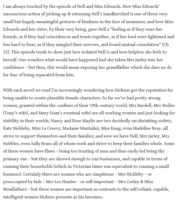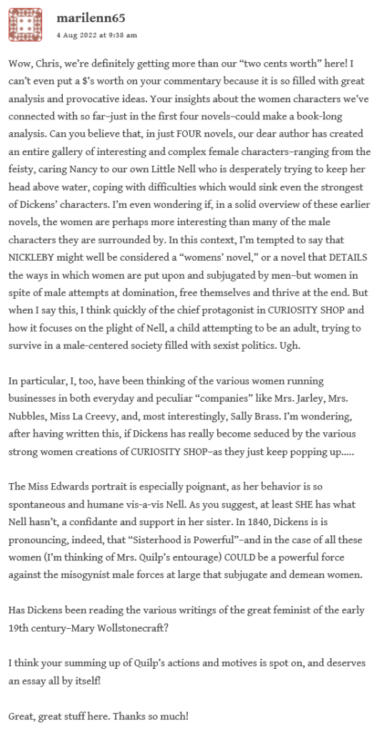 Lenny responds, wondering whether Dickens himself has become seduced by these powerful female characters, comparing the Curiosity Shop‘s women to those in Nicholas Nickleby. Might we even call them “womens’ novels”?