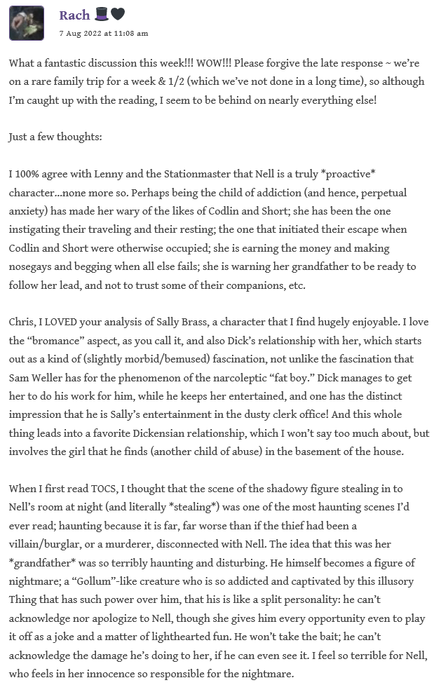 I chimed in belatedly this week, and focused mostly on the “nightmare” of Nell’s grandfather, “Gollum-like,” sneaking in to steal money from his granddaughter. In the light of day, he is almost unable to acknowledge the existence of this shadow self, as this scene has always felt like one of the most haunting in literature to me: