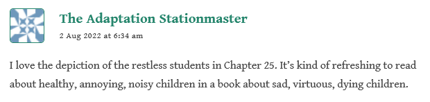 Arrgh! I meant to write “couldn’t take Quilp’s character seriously,” not “could.” Typos are such a pain when you can’t fix them.