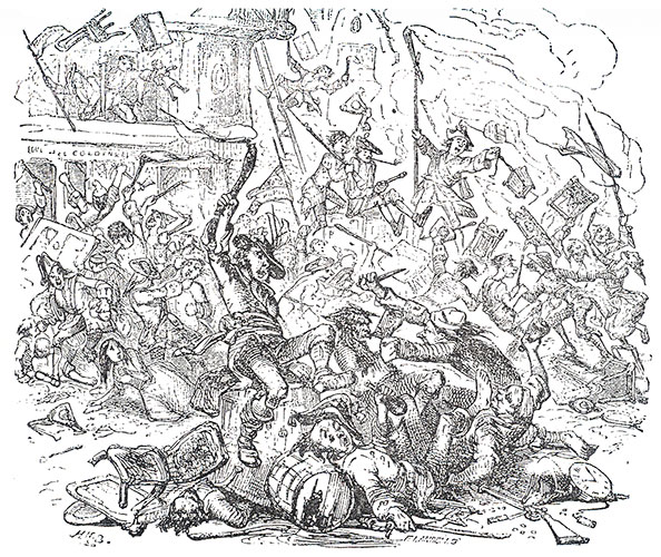 βThe furniture being very dry, and rendered more combustible by wax and oil, besides the arts they had used, took fire at once. The flames roared high and fiercely, blackening the prison-wall, and twining up its loftly front like burning serpents. At first they crowded round the blaze, and vented their exultation only in their looks: but when it grew hotter and fiercer–when it crackled, leaped, and roared, like a great furnace–when it shone upon the opposite houses, and lighted up not only the pale and wondering faces at the windows, but the inmost corners of each habitation– when through the deep red heat and glow, the fire was seen sporting and toying with the door, now clinging to its obdurate surface, now gliding off with fierce inconstancy and soaring high into the sky, anon returning to fold it in its burning grasp and lure it to its ruin–when it shone and gleamed so brightly that the church clock of St Sepulchre’s so often pointing to the hour of death, was legible as in broad day, and the vane upon its steeple-top glittered in the unwonted light like something richly jewelled– when blackened stone and sombre brick grew ruddy in the deep reflection, and windows shone like burnished gold, dotting the longest distance in the fiery vista with their specks of brightness–when wall and tower, and roof and chimney-stack, seemed drunk, and in the flickering glare appeared to reel and stagger– when scores of objects, never seen before, burst out upon the view, and things the most familiar put on some new aspect–then the mob began to join the whirl, and with loud yells, and shouts, and clamour, such as happily is seldom heard, bestirred themselves to feed the fire, and keep it at its height.β