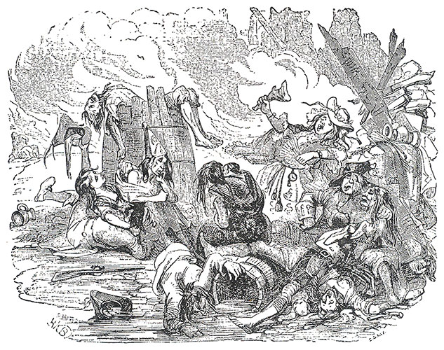 They make a large pile of dry furniture, smeared with pitch, tar, resin, and turpentine, and make a bonfire by the door of the prisonβbut the fire spreads, now threatening to take over the whole building, an βinfernal christening.β