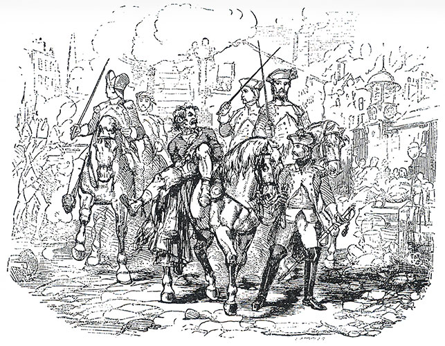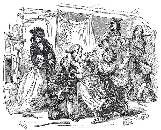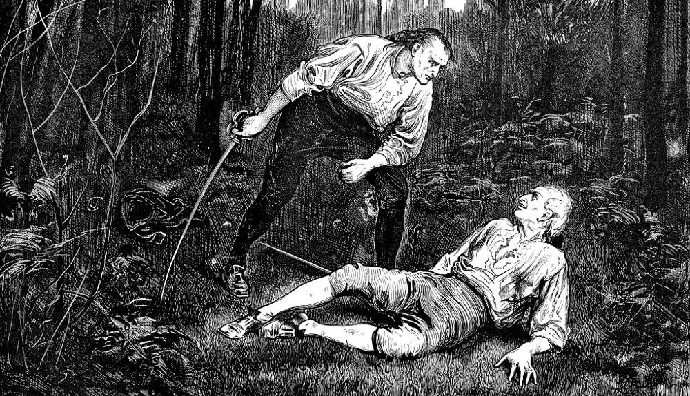 “After a few seconds they grew hotter and more furious, and pressing on each other inflicted and received several slight wounds. It was directly after receiving one of these in his arm, that Mr Haredale, making a keener thrust as he felt the warm blood spirting out, plunged his sword through his opponent’s body to the hilt.