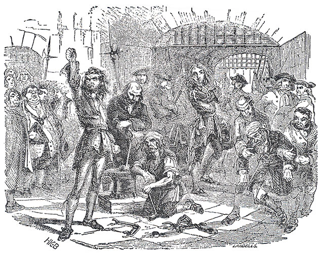 They all march to Newgate, with Varden being forced to accompany them. There, the jailer refuses to release any prisoners. Varden still declares his resolution not to help the rioters under any condition; he is attacked, but then saved by a one-armed man.
