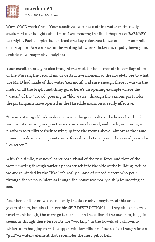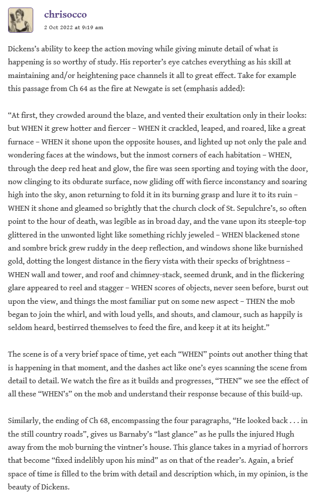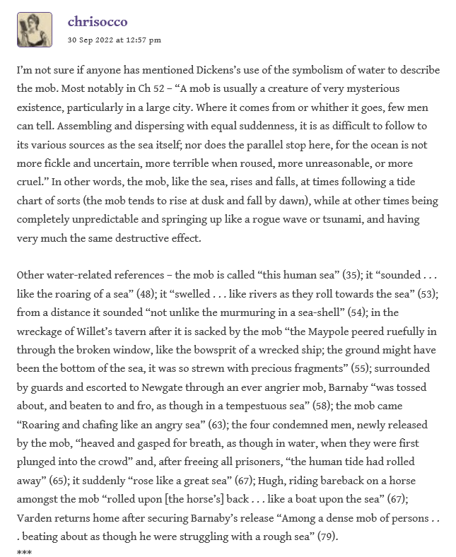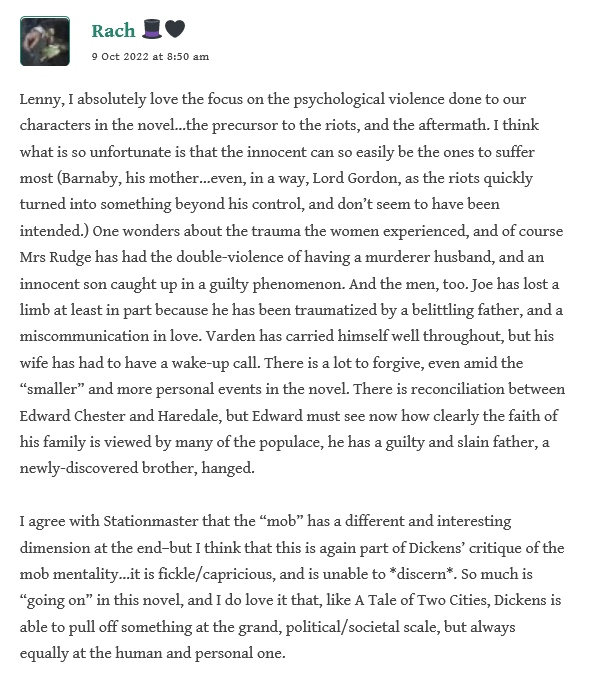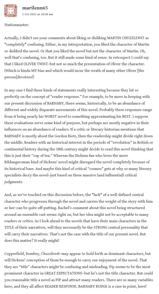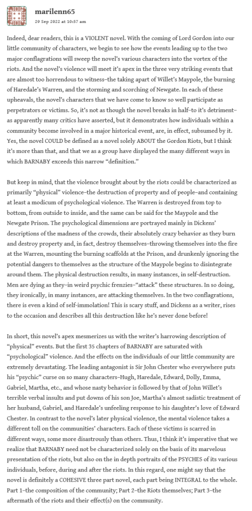 After Stationmaster had cleared up a bit of perceived confusion about a typo, Lenny reflects on the “reader response” and the “widely disparate assessments of this novel” among the critics–perhaps depending on the perception of it as a historical novel about the Gordon riots, and that alone; versus the readers who disregard it because it doesn’t fit in with Dickens’ typical structure, that of the bildungsroman. He considers also our ongoing discussion of “the lack of a well-defined central character” and how this impacts our response: