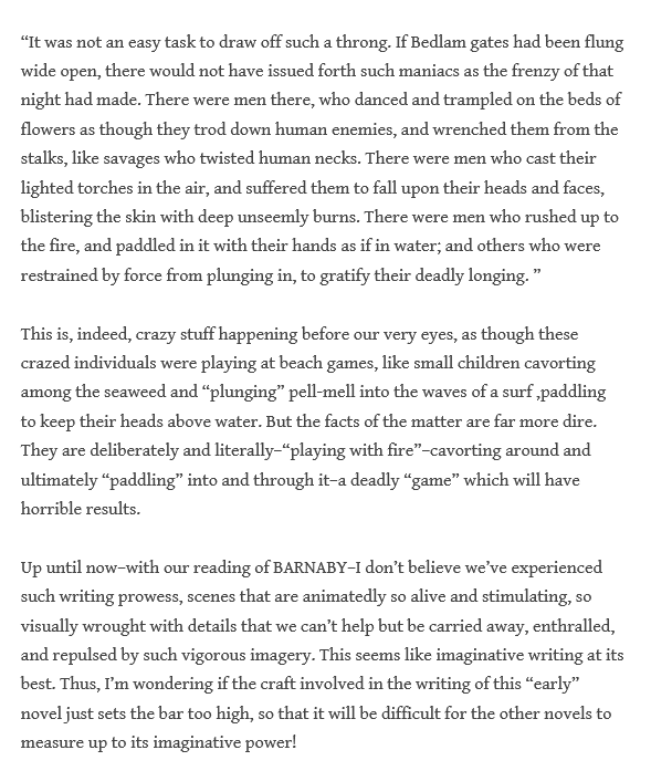 - Calling for a “Barnaby Revolution” (We’ve been hitting on this theme all around: Henry’s interest that this novel should be better known and appreciated; Dana and Cassandra were finding it to be a favorite so far; we all enjoyed it far more than we anticipated, and Lenny sees a whole new level of mastery in Dickens’ writing.)