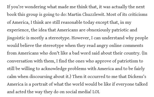 On another note, especially considering our upcoming “American” reads, the Stationmaster considers whether “Dickens’s America is a portrait of what the world would be like if everyone talked and acted the way they do on social media”: