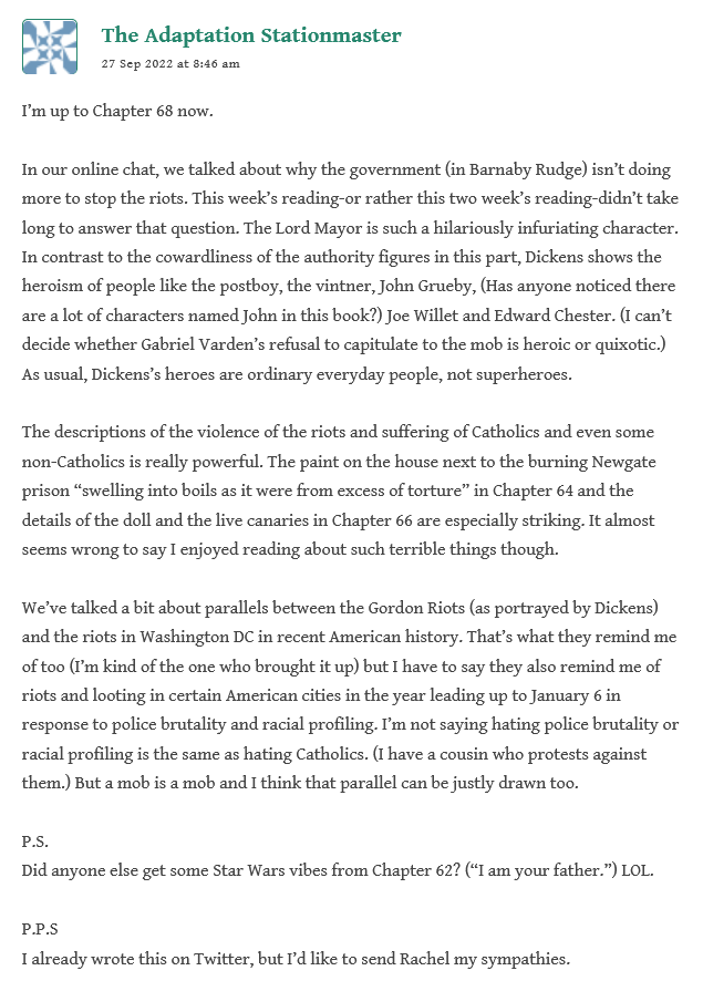 In case you missed it, our member Henry Oliver wrote a beautiful reflection on his experience reading Barnaby Rudge, and on its applicability.