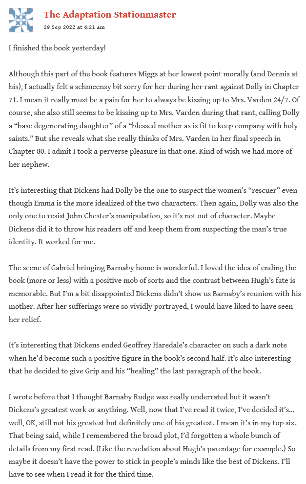Friends, thank you for your patience as I waited an additional week to post our final wrap-up of Barnaby Rudge, due to personal engagements along with an unexpected bout of Covid!