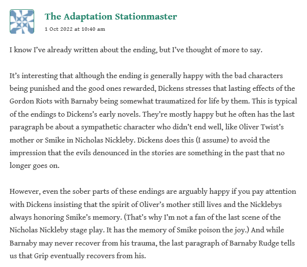 The Stationmaster has been bringing us around again to Dickens’ crafting of the characters, even ones that we dislike but feel a little sorry for–including scenes he wishes had been added, like Barnaby’s reunion with his mother: