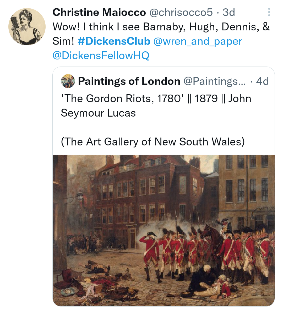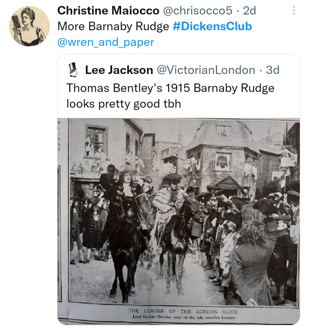 Meanwhile, Chris shared some fabulous related images: John Lucas’ painting of the Gordon riots, and a still from the 1915 film of Barnaby Rudge!