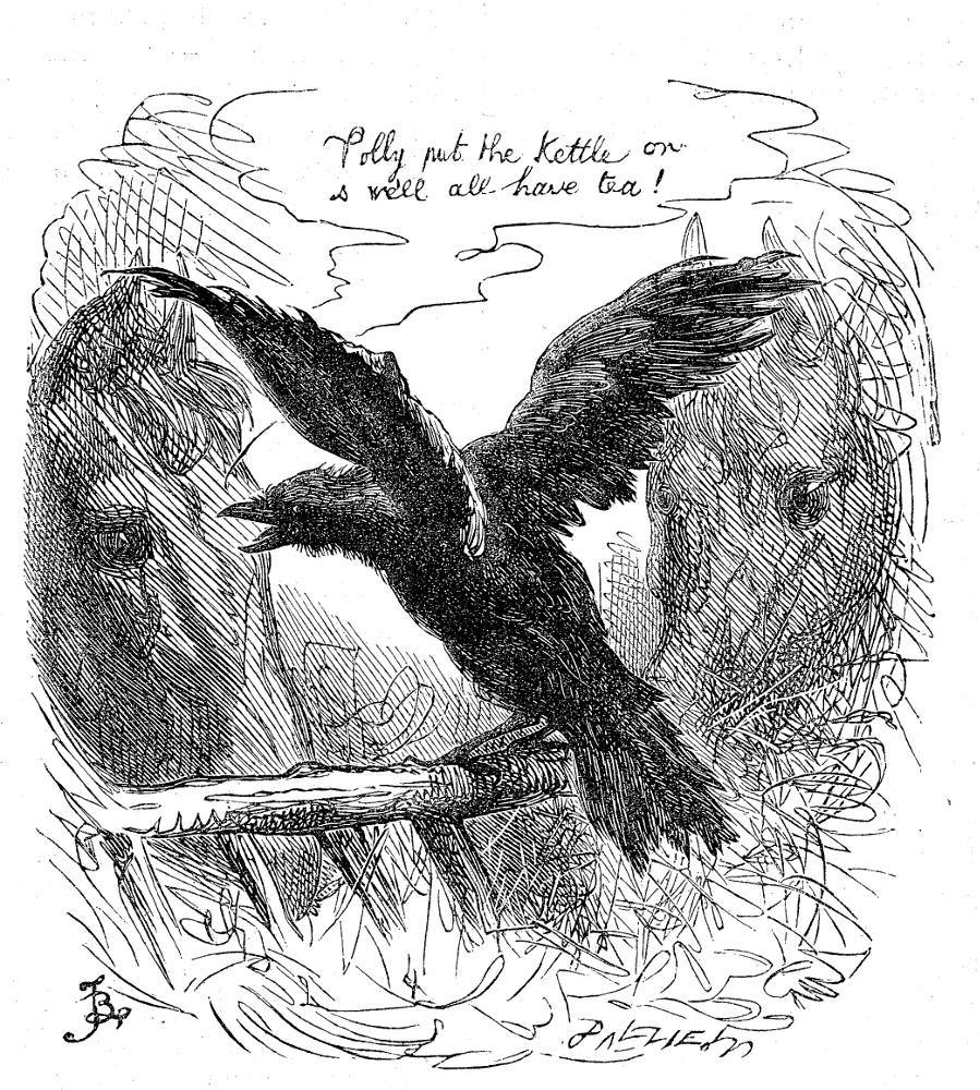 “Grip soon recovered his looks, and became as glossy and sleek as ever…but certain it is that for a whole year he never indulged in any other sound than a grave, decorous croak. At the expiration of that term, the morning being very bright and sunny, he was heard to address himself to the horses in the stable, upon the subject of the Kettle, so often mentioned in these pages; and before the witness who overheard him could run into the house with the intelligence, and add to it upon his solemn affirmation the statement that he had heard him laugh, the bird himself advanced with fantastic steps to the very door of the bar, and there cried, βIβm a devil, Iβm a devil, Iβm a devil!β with extraordinary rapture.”