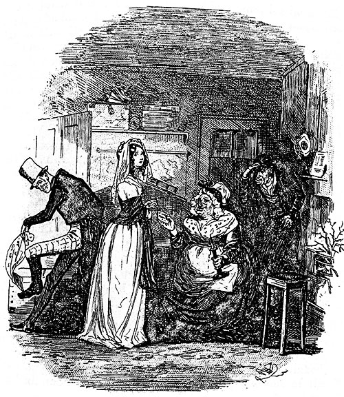 She overhears John Westlock talking about the patient, an old schoolfellow of his, and Westlock wants to supplement any needed money for care of the patient. However, in the patient’s delirious chatter, Jonas Chuzzlewit is mentioned. Meanwhile, “Poll” (Paul) the barber has come with young Bailey to help Mrs. Gamp move out of Jonas Chuzzlewit’s house. Mrs. Gamp—whose services are no longer needed, according to Jonas—notices that the recently married Mercy (married a month prior) is looking unwell and unhappy. Chuffey, realizing that she is married to Jonas, curses the wicked house.