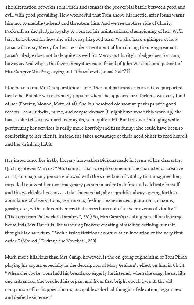 Chris comments on how “the altercation between Tom Pinch and Jonas is the proverbial battle between good and evil, with good prevailing.” She also finds Mrs. Gamp to be “not as funny as critics have purported her to be”; yet, “Mrs Gamp’s creating herself or defining herself via Mrs Harris is like watching Dickens creating himself or defining himself though his characters”: