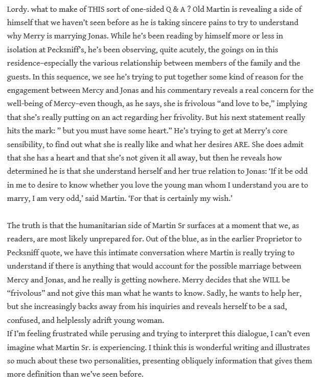 Pecksniff is an utterly **brilliant** iconic character, and of course I love Tom and Mark, but otherwise, there are not many here with whom I want to spend my days like I do with Sam, Pickwick, Nicholas & Noggs, Mr. Mantalini, Dick and the Marchioness, etc…