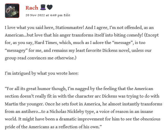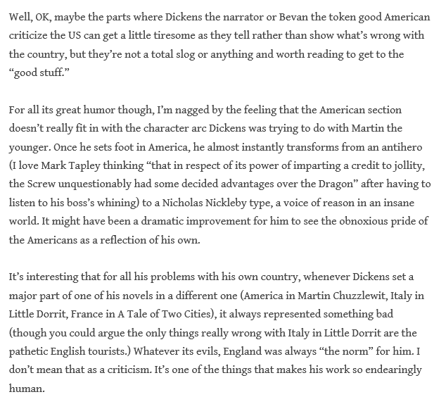 “I guess if I were to take issue with any part of Dickens’s satire of America or say that America has progressed past it by now, it’s the idea that Americans are obnoxiously patriotic or jingoistic” but “other than that, I’d say Dickens’s satire of the USA was pretty spot on. LOL. (Actually, I’d say that even the part I just pushed back against was spot on. Just more spot on for Americans I meet on social media than the ones I meet face to face.)”
