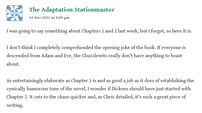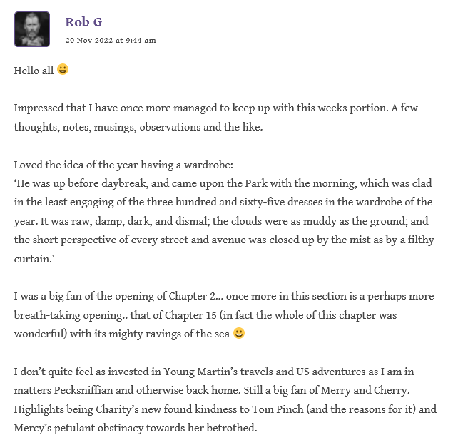 Rob “loved the idea of the year having a wardrobe”, and was thrilled with Chapter 2’s opening. He is preferring the Pecksniffian shenanigans in England to the adventures in America with Martin and Mark: