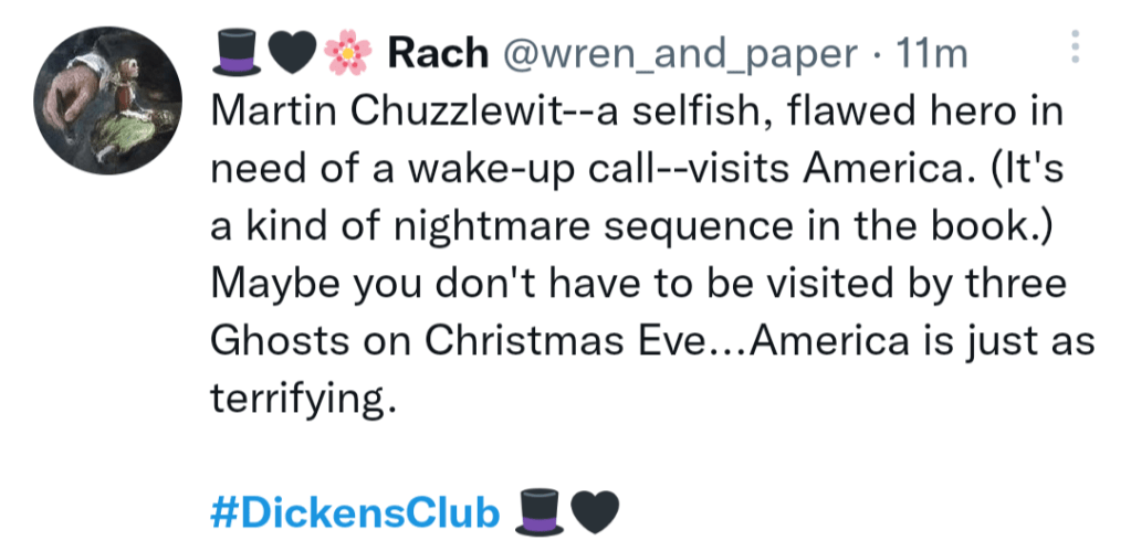 If you’re counting, today is day 322 (and week 47) in our #DickensClub! Today we wrap up our second week of Martin Chuzzlewit, our ninth read of the group. Please feel free to comment below this post for the third week’s chapters, or use the hashtag #DickensClub if you’re commenting on twitter.