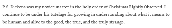 Daniel’s comment makes for a wonderful conclusion to this discussion on Dickens as the teller of a modern fairy-tale, and “novice master in the holy order of Christmas Rightly Observed”: