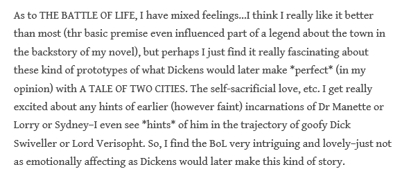 The Stationmaster finds the plot to The Battle of Life “dumb,” by comparison to Dickens’s other works, and Marion’s act of self sacrifice “rather crazy and selfish”: