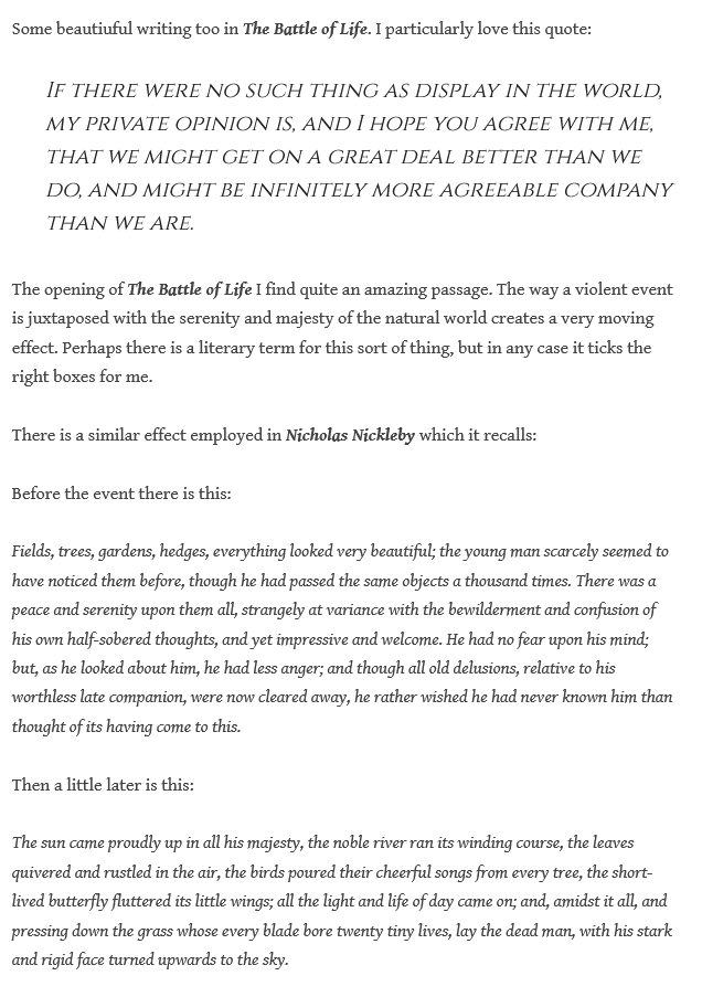 - I have not been able to incorporate all of the wonderful comments, but I’ve tried to give a full “essay” space for each member’s special topic–e.g. Chris wrote at length about A Christmas Carol, as did Gaby and Daniel; the Stationmaster wrote at length about The Chimes and Cricket; Rob took on The Battle of Life; Chris and I both touched on memory in The Haunted Man. So, if you see that there are “selections” with a few complete “essays,” it is an effort to offer at least one complete essay per book/member, so as not to run on too long. Please let me know if I missed anyone! All the insights were marvelous and enriching.