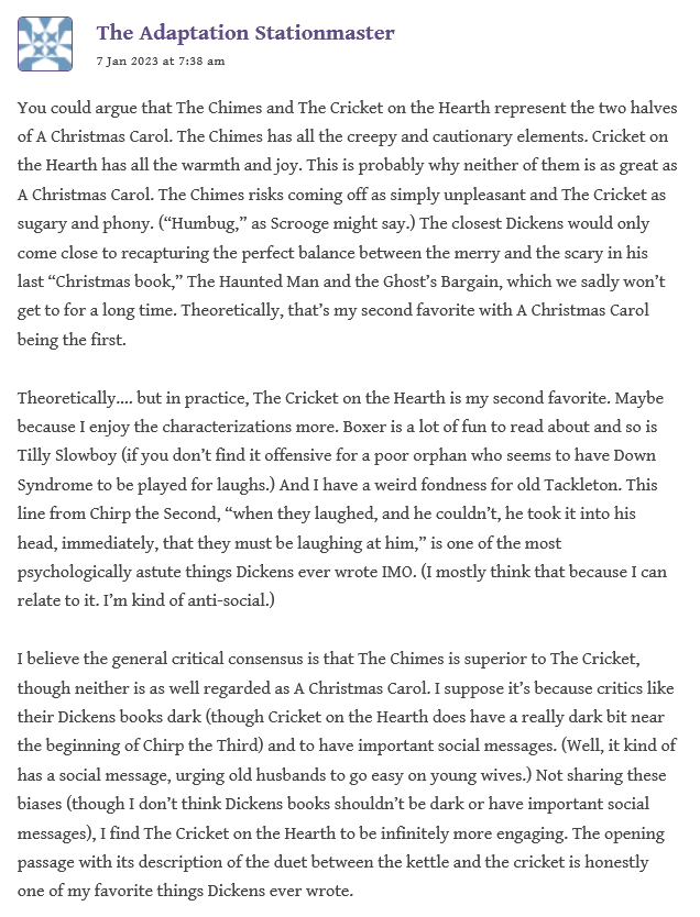 I also want to note once again Dr. Christian’s marvelous thread on The Cricket on the Hearth: