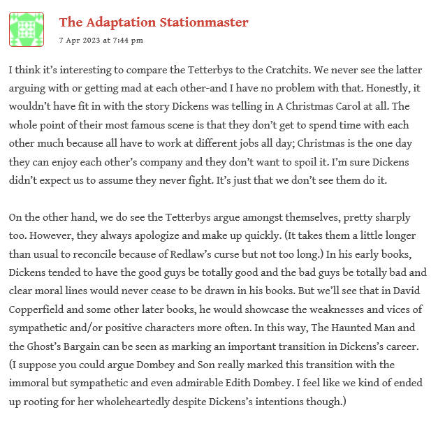 On The Haunted Man, the Stationmaster compares the Tetterbys to the Cratchits, considering whether Dickens’s willingness to grapple with both the light and dark shadings of our sympathetic characters in his last Christmas book (as compared with the earlier books) points to a change that will be carried on into David Copperfield and beyond: