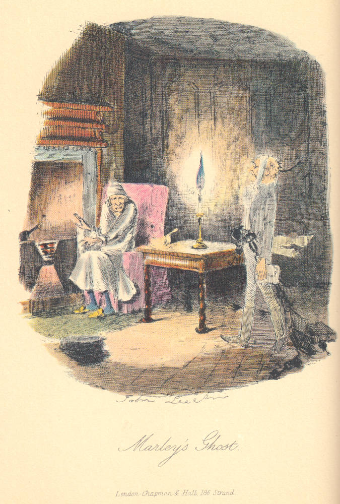 Scrooge is well and truly alone. He has his solitary meal in a nearby tavern. He returns to his solitary home—only to find, in the door knocker, the image of the face of his former partner, Jacob Marley, who had died seven years ago that very night. Later, the sounds of chains and bells echo through the house, and Marley’s Ghost, laden with chains and shackles like a purgatorial spirit, enters his room. Scrooge, frightened but still skeptical, calls it all “humbug”—until Marley nearly frightens Scrooge out of his wits and forces his attention. Marley has come for a purpose: to induce Scrooge to change his selfish ways before it is too late, before the chain that Scrooge has been forging for so many years becomes unbearably long and heavy. To effect this, Scrooge is to be visited by three Spirits that night—the night of Christmas Eve into Christmas morning.