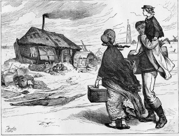 Mr Peggotty is like a fairy godfather to several people he has taken into his home: his orphan nephew, Ham, a strong youth; his orphan niece, little Emily, about David’s age; Mrs Gummidge, a cranky old widow of a friend of his.