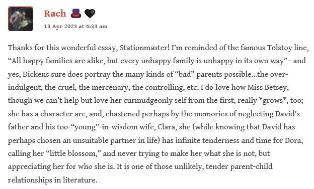 Friends, what a joyous first week of David Copperfield! We’ve had Boze’s insightful and heartfelt introduction to this work, supplemental readings shared by Chris, a post on parental figures by the Stationmaster, and wonderful comments to enrich our reading!