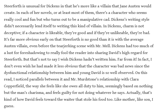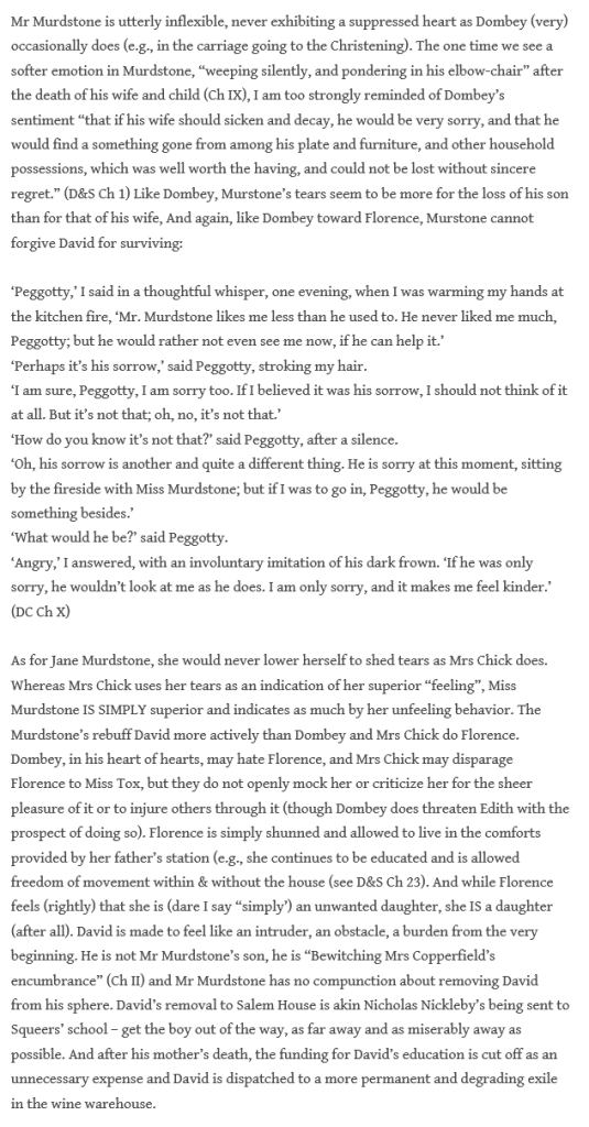 As long as I’m writing about Steerforth, I’d like to expand on what I wrote before about how young David’s relationship with Steerforth reminded me of Clara’s relationship to Murdstone. Both David and his mother see any mildly nice thing their bullies do for them as evidence of how great they are and ignore all the bad things they do.