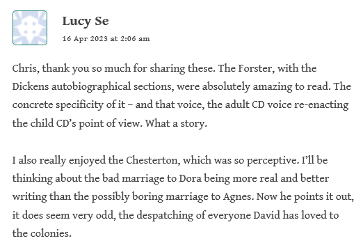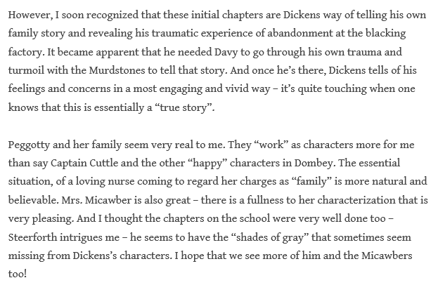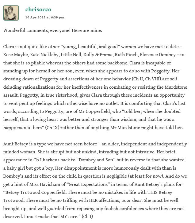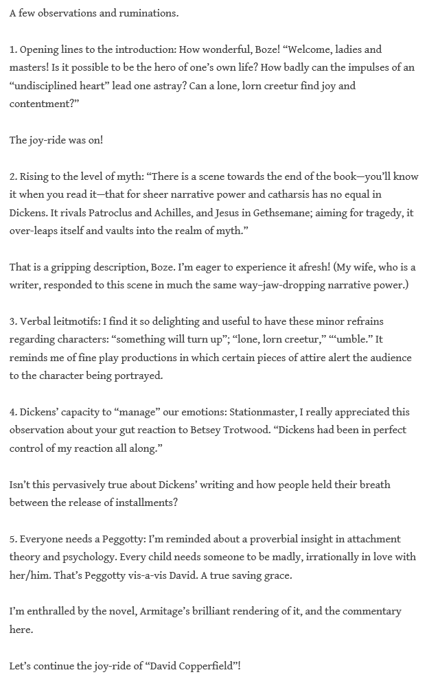 Thanks to Boze, Rachel, Chris, Stationmaster, and to all who are enriching our read of Copperfield.