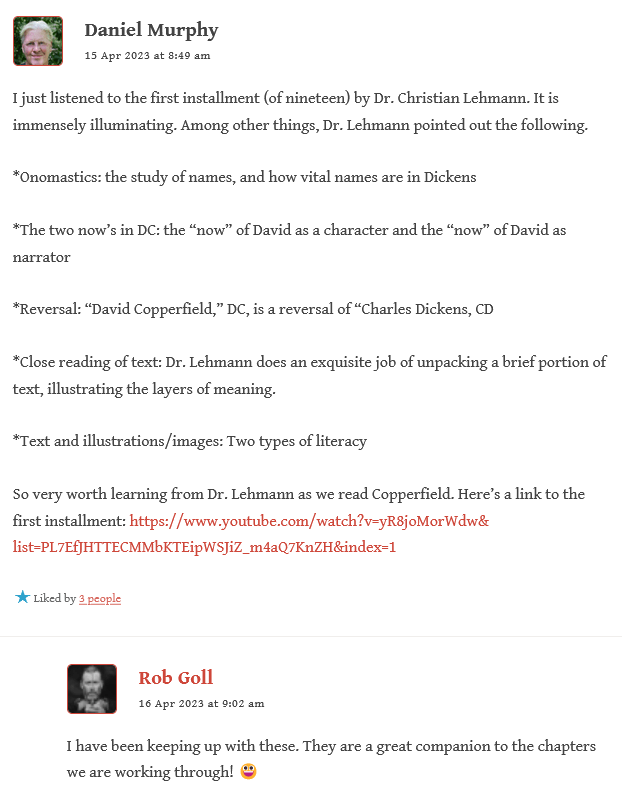Several of us have been watching–or rewatching–Dr. Christian’s recorded lecture series on David Copperfield. Daniel has some marvelous comments on the first installment: