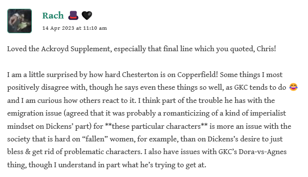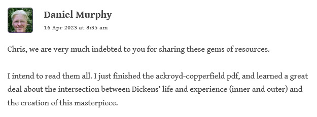 After Boze’s insightful and heartfelt tribute to David Copperfield in his Introduction, Chris shared some marvelous supplemental materials as well–e.g. from Peter Ackroyd and G.K. Chesterton.