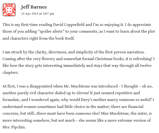 Jeff gives us a timely reminder about how much the “spoiler alerts” are appreciated, as this is his first time reading the novel. He considers the characterization of Murdstone and his sister, as well as of the Peggotty family, and the “gray” shades of Steerforth: