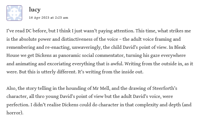 Lucy, who has read the novel before, is particularly struck by “the absolute power and distinctness of the voice” as the adult recalls the child’s perspective, rather than the “panoramic social commentator.” Dickens is here, as she says, “writing from the outside in”: