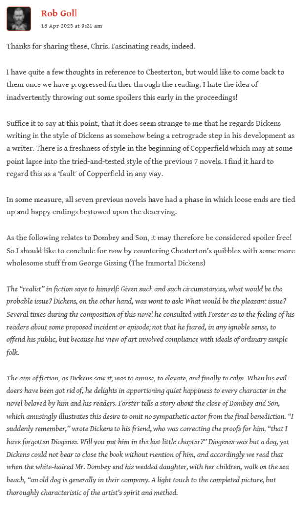 Rob has some reservations too about the Chesterton, but will be coming back to it later when it won’t avoid spoilers. He balances the views with that of George Gissing: