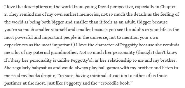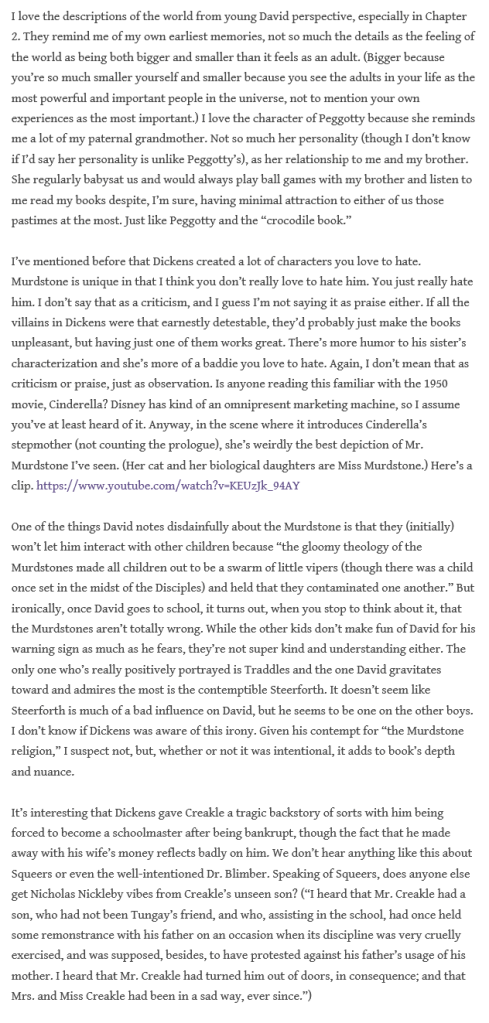 Here are the three installments for this week’s reads, and I particularly loved his discussion of Mr Dick and disability: