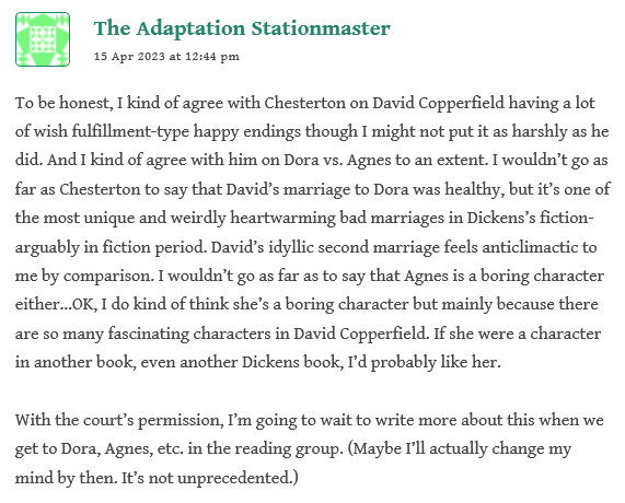 I was pondering the idea that the Stationmaster and Lenny were discussing, about the novel’s “moral center”, and I was thinking of this in connection to Dr Christian’s commentary on Installment V, and the section on Mr Dick, Dickens, & Disability–a subject particularly close to my heart, as I’ve worked with those with intellectual and developmental disabilities. Miss Betsey’s advocacy of Mr Dick (and Mr D is another of my very favorite characters in literature) makes her truly a hero to me. I love the way in which Miss Betsey, as brought out by Dr Christian in the lecture, considers the *treatment* of Mr Dick as the *real* “madness” (as opposed to the perception that Dick himself is “mad”); what he has is such a natural empathy (shown in the common-sensical advice about what to do with David, e.g. to give him a bath, to put him to bed, etc–all of which are essentially saying: “we are his family now”). In Mr Dick, there is no trace of the self-serving or self-absorption of a Steerforth, who *seems* to be advocating for you, but only when it tickles his fancy or serves himself (as when he takes charge of David’s money, ostensibly for safekeeping).
