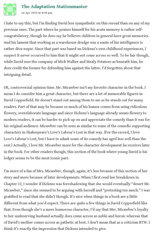The Stationmaster is finding some interesting differences in his experience reading David now, versus earlier: less sympathy with David himself, and less interest in Micawber.