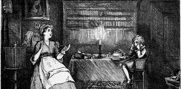 “Mrs. Gummidge’s peculiar corner of the fireside seemed to me to be the warmest and snuggest in the place, as her chair was certainly the easiest, but it didn’t suit her that day at all. She was constantly complaining of the cold, and of its occasioning a visitation in her back which she called ‘the creeps’. At last she shed tears on that subject, and said again that she was ‘a lone lorn creetur’ and everythink went contrary with her’.”