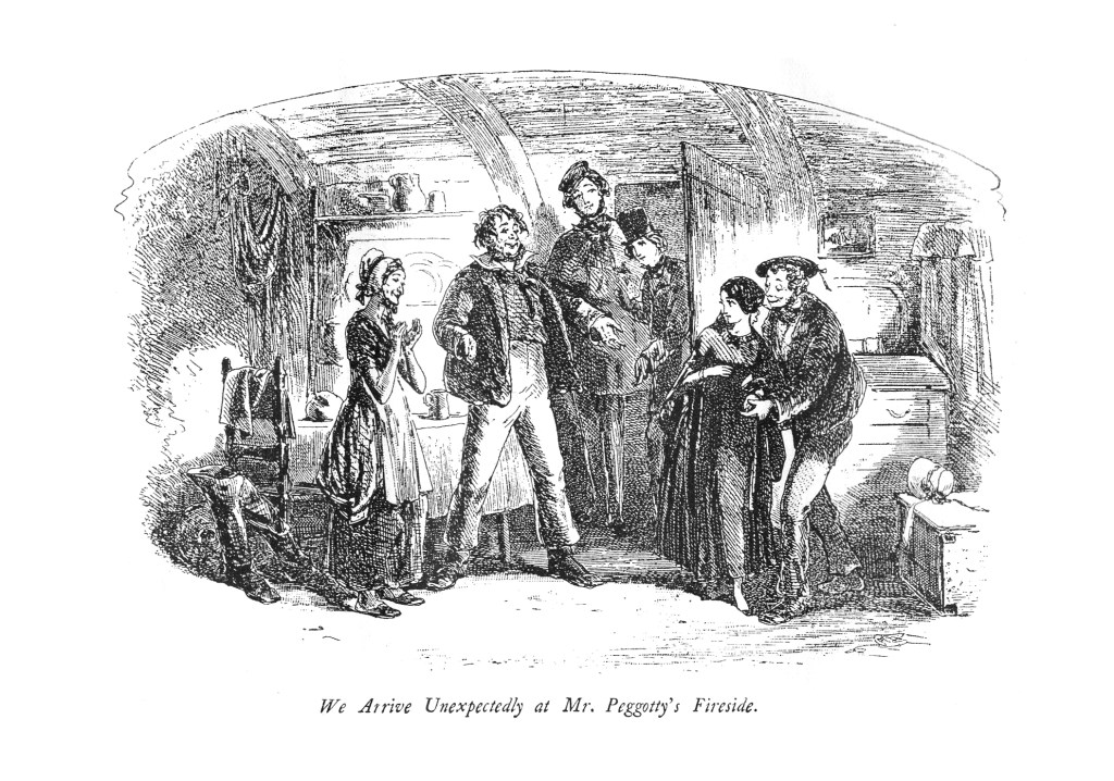 The reunion with David’s old nurse Peggotty—whom he hasn’t seen in so long that he is barely recognizable to her—is warm and tear-filled. Her husband, Mr Barkis, has been ill. Steerforth, who has accompanied David in dinner with Peggotty, insists that David stay there as she would wish, and he will return to his hotel quarters. Steerforth later accompanies David in a surprise visit to Mr Peggotty’s boat house, and they come upon a merry party, as Ham and Emily have just decided that very night that they would soon be married; even Mrs Gummidge seems less of a lone, lorn creature than she usually makes herself out to be. Emily tries to make herself scarce upon their entrance, and appears to be made both fascinated and uncomfortable by them. Steerforth charms everyone—including the bashful Emily.