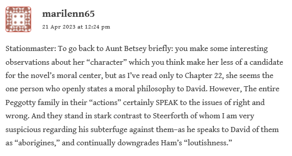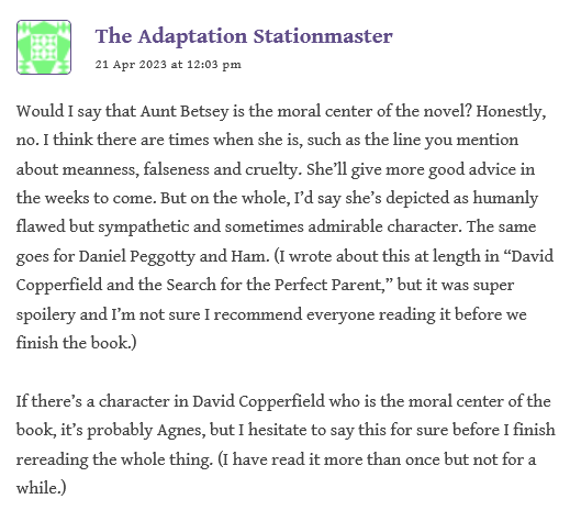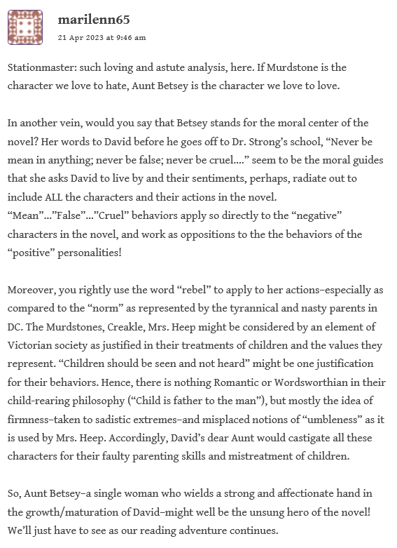 The Stationmaster considers Miss Betsey as “humanly flawed but sympathetic and sometimes admirable,” but that Agnes is probably a better candidate for the “moral center” of the novel”:
