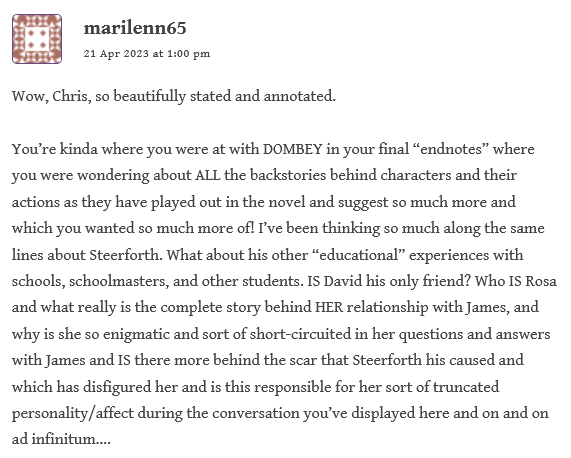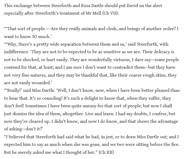 But, of course it IS Dickens’ novel, really, and his composition at this point, it seems to me, is really complex and a tough one to devise. How much will he let David know, here, how much will he let David let the reader know, and how much should he withhold from David and the reader!????