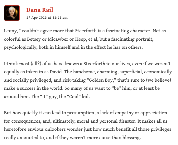 Dana agrees with Lenny about Steerforth’s fascination as a character, “not as colorful as Betsey or Micawber or Heep…but a fascinating portrait, psychologically, both in himself and in the effect he has on others.” Have “most (all?) of us known a Steerforth in our lives”?