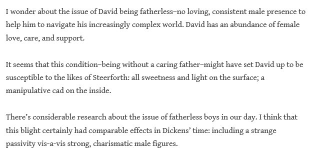 Daniel considers the instances of “fatherless boys” in Dickens, and the “passivity vis-a-vis strong, charismatic male figures,” so applicable to our own time, and all time: