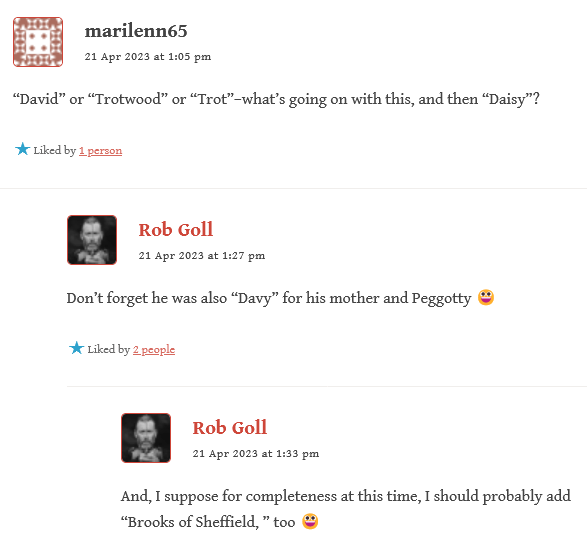 OK, I’ve got to mention this. The other day, I was watching a humorous YouTube video and it had a joke about how someone never pays their bills. I couldn’t resist commenting that that was Micawber’s motto even though I didn’t expect there to be any target audience overlap between David Copperfield and the video. But three people liked my comment and one of them replied saying, “Dickens and I are grateful to you” or something like that. That’s not a lot of people recognizing the reference, but it was still more than I expected, and I’m gratified.