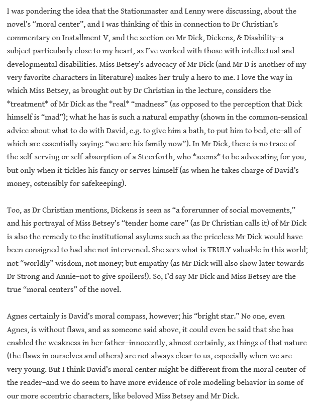 I consider that all the characters are flawed, but that although Agnes is David’s own moral compass, this is different from, perhaps, the moral center for the reader in Dickens, and that Miss Betsey and Mr Dick are my favorite candidates for that position. I also touch on Dr Christian’s Installment V lecture, on Mr Dick and Disability: